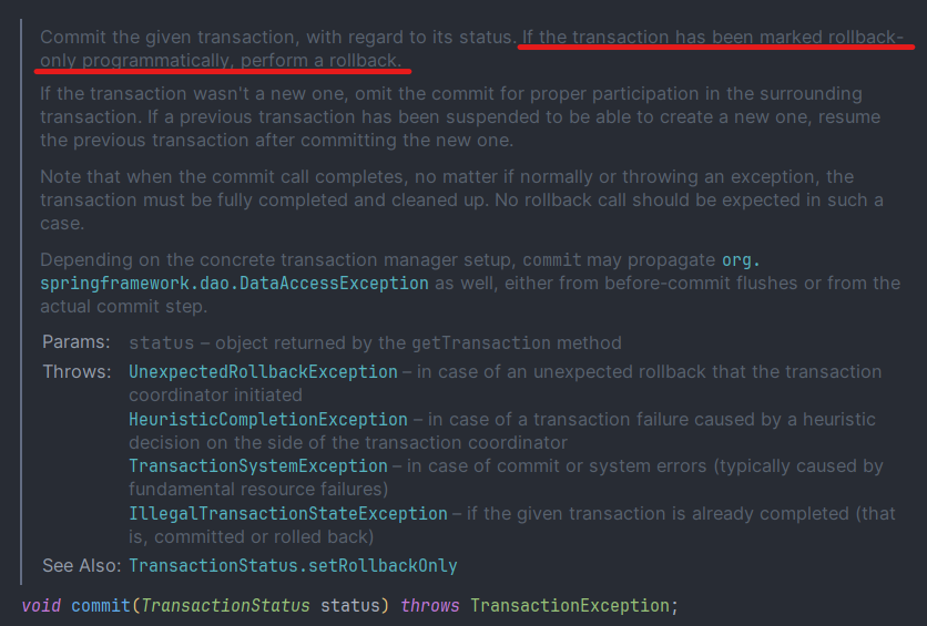 commit 시점에 가장 중요한 값은 TransactionStatus's rollbackOnly이다