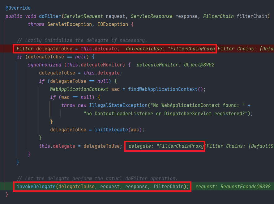 DelegatingFilterProxy의 doFilter에서는 현재 들어온 요청을 위임할 delegateToUse를 찾는다