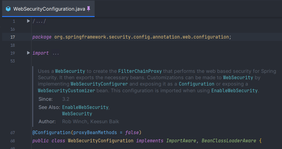 - 위의 코드는 Spring Security 설정에 필수적인 HttpSecurity 클래스를 스프링 빈으로 등록함으로써 커스텀하게 가져다가 여러 설정들을 추가할 수 있게 된다