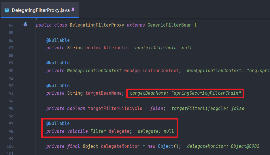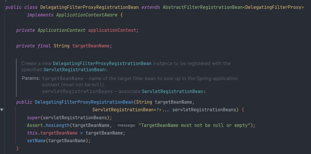 - DelegatingFilterProxyRegistrationBean을 생성할 때 targetBeanName에는 springSecurityFilterChain이라는 이름이 들어감을 확인할 수 있다