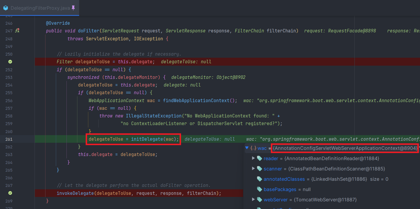 DelegatingFilterProxy의 doFilter에서는 현재 들어온 요청을 위임할 delegateToUse를 찾는다