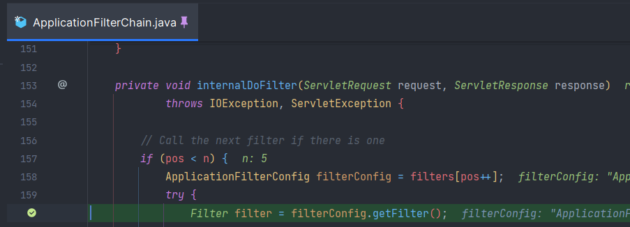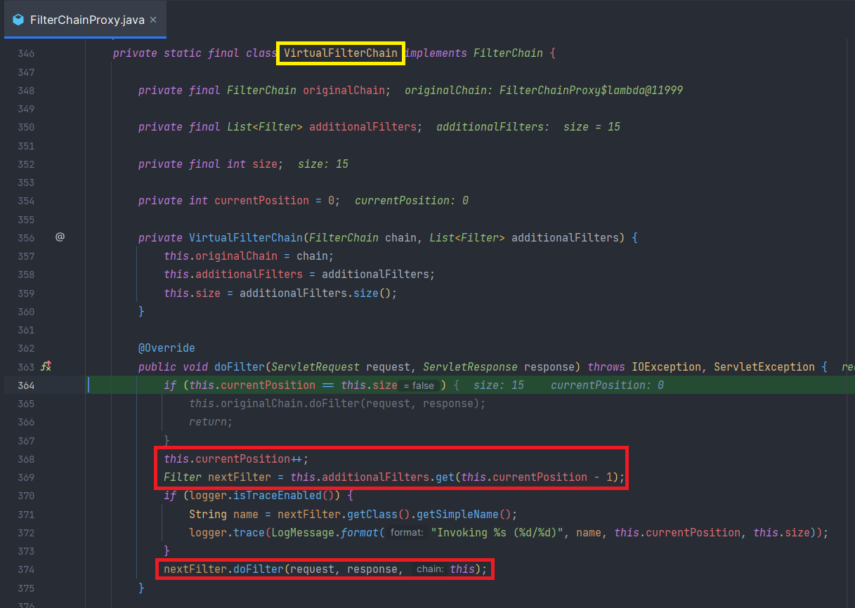 위에서 현재 요청에 대한 필터링을 진행할 chain의 필터를 가져온 후 FilterChainProxy의 static final class인 VirtualFilterChain에서 가져온 필터들에 대해서 순차적으로 필터링을 진행하게 된다