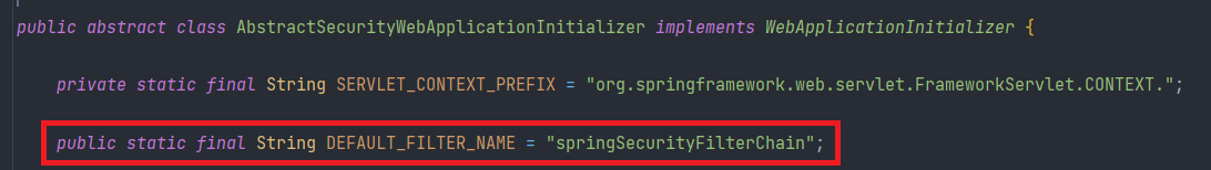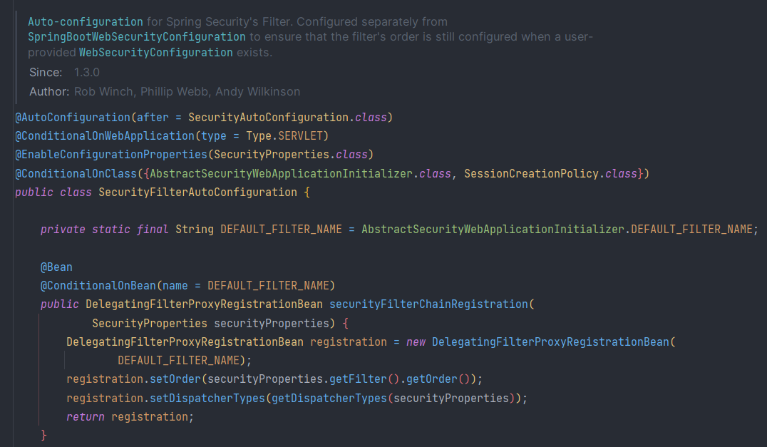 - 그런데 @ConditionalOnBean부분을 보니 DEFAULT_FILTER_NAME이라는 이름을 가진 빈이 존재해야 DelegatingFilterProxyRegistrationBean도 등록됨을 알 수 있다