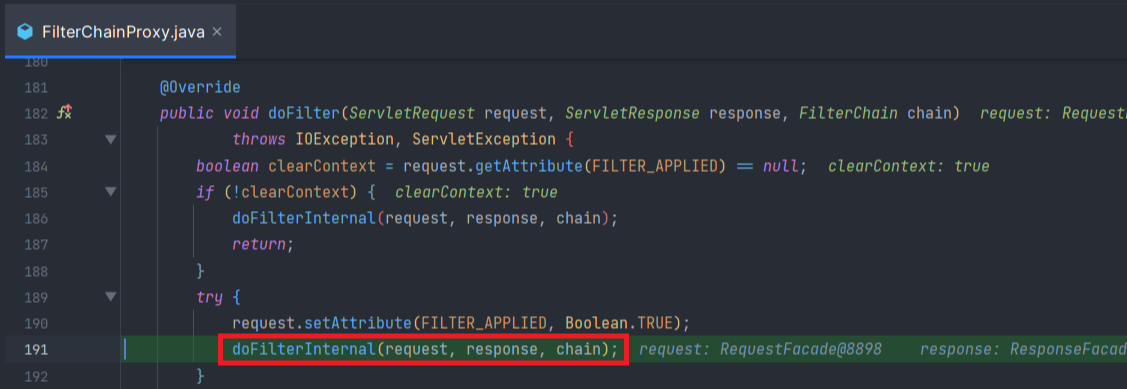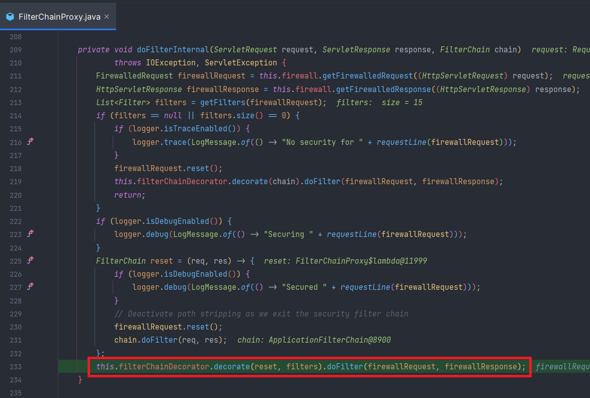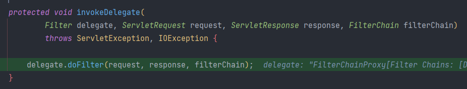 DelegatingFilterProxy에서는 요청을 위임할 delegateToUse(FilterChainProxy)를 찾아왔고 이제 invoke를 통해서 FilterChainProxy로 위임하는 로직으로 들어가게 된다