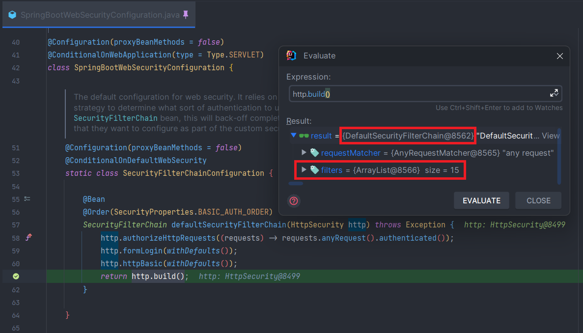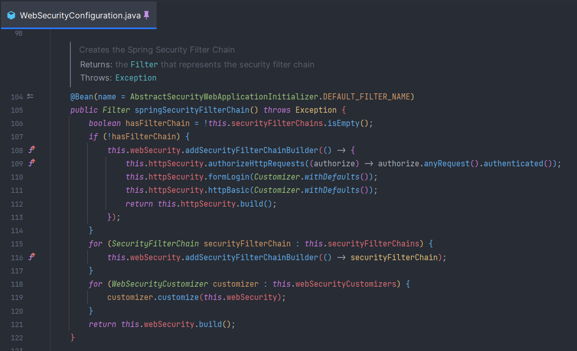 SpringBootWebSecurityConfiguration 내부에서 가장 Basic한 Security 인증/인가 처리를 위한 SecurityFilterChain을 빈으로 등록함을 확인할 수 있다