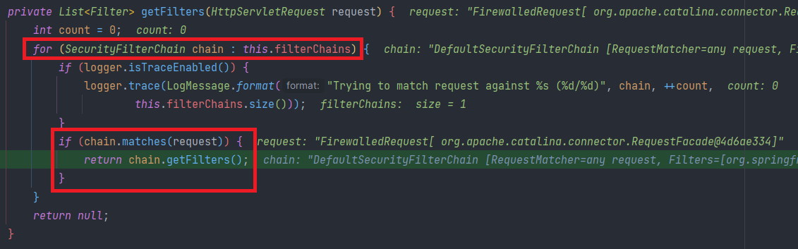 FilterChainProxy가 가지고 있는 List<SecurityFilterChain>에 대해서 loop를 돌면서 matches를 통해 현재 요청에 적절한 chain을 찾은 후 해당 chain이 가지고 있는 필터들을 반환한다