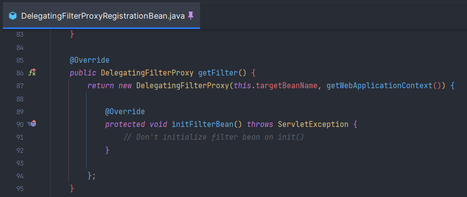 SecurityFilterAutoConfiguration에서는 DelegatingFilterProxyRegistrationBean이란 클래스를 빈으로 등록하는 모습을 볼 수 있다