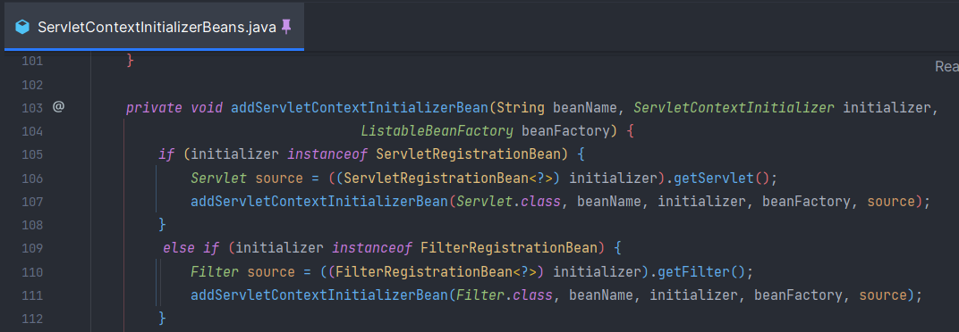 - DelegatingFilterProxyRegistrationBean에서는 getFilter를 통해서 DelegatingFilterProxy를 얻을 수 있고 ServletContainerInitializerBeans의 add 로직에서 이를 활용해서 DelegatingFilterProxy를 add함을 확인할 수 있다