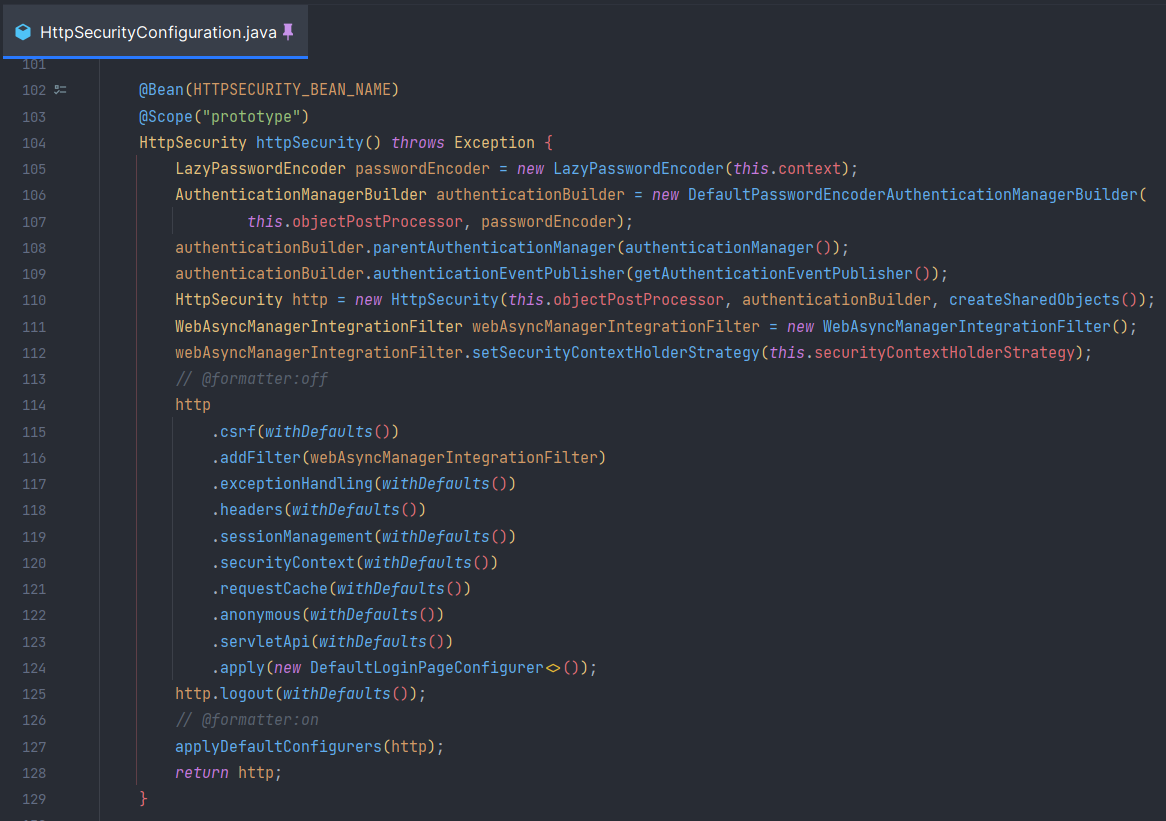 - 위의 코드는 Spring Security 설정에 필수적인 HttpSecurity 클래스를 스프링 빈으로 등록함으로써 커스텀하게 가져다가 여러 설정들을 추가할 수 있게 된다