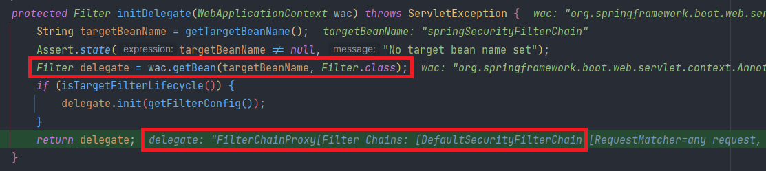 initDelegate 흐름에서는 springSecurityFilterChain이라는 이름으로 등록된 빈을 찾게 된다