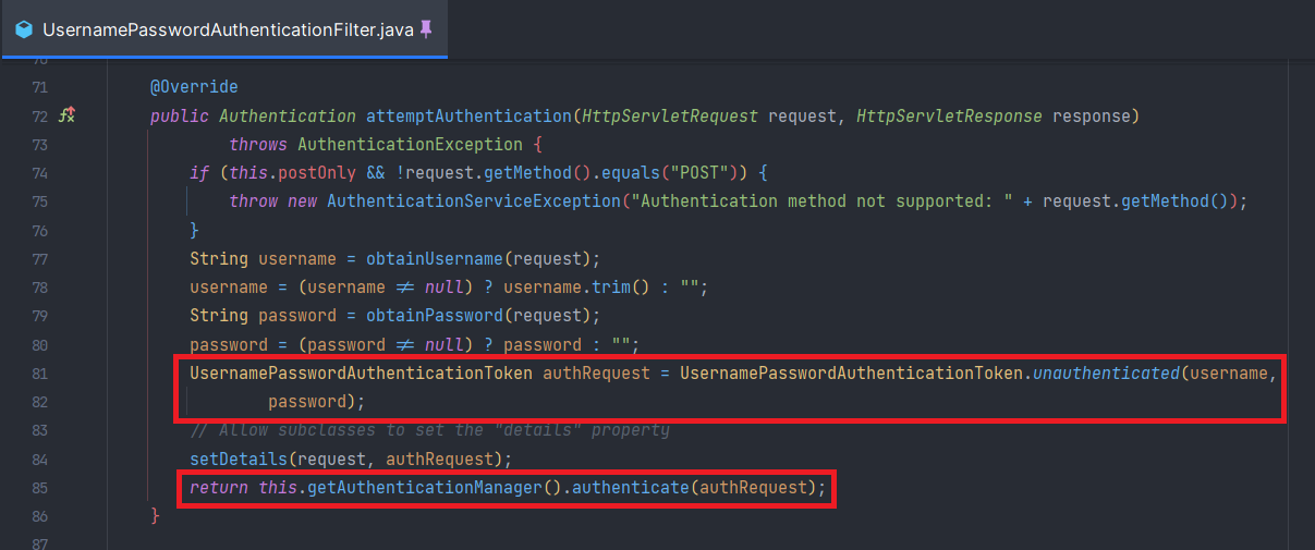 - isAuthenticated = false인 UsernamePasswordAuthenticationToken을 통해서 인증 프로세스 진행