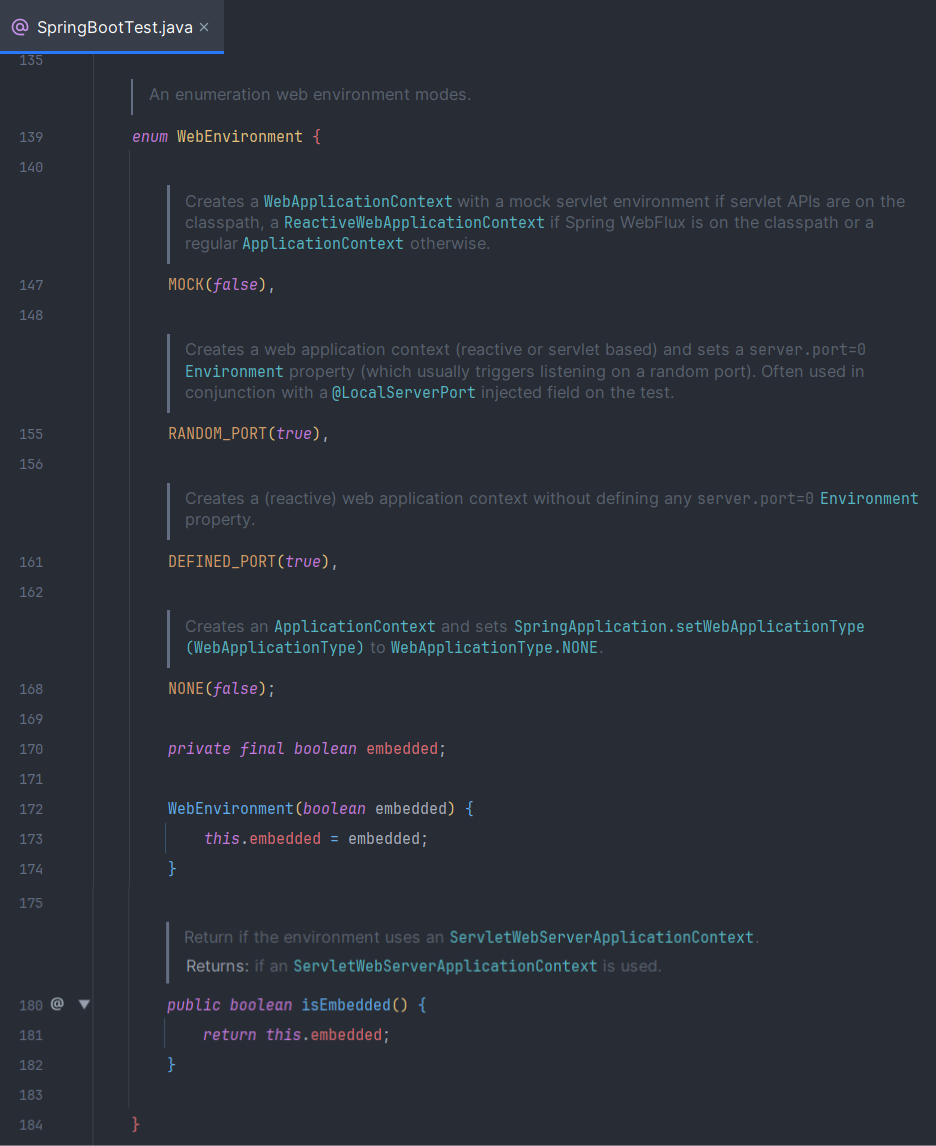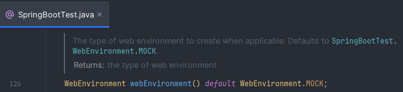 일반적으로 통합테스트를 위해서 적용하는 @SpringBootTest는 WebEnvironment 기본값이 WebEnvironment.MOCK으로 지정되어 있다