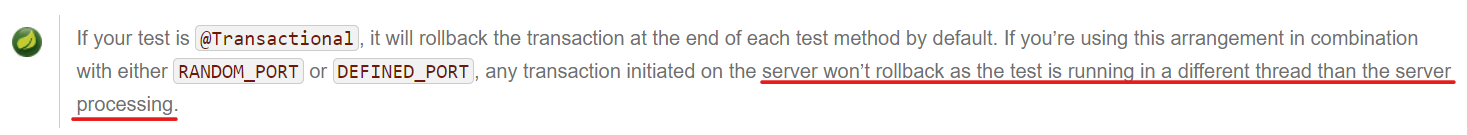 문서에 나와있듯이 RANDOM_PORT / DEFINED_PORT를 활용해서 실제 Servlet Container 환경을 띄운다면 @Transactional을 적용한다고 하더라도 서버 자체가 별도의 쓰레드로 Spring Container를 실행하기 때문에 테스트가 격리되지 않을 수 있다