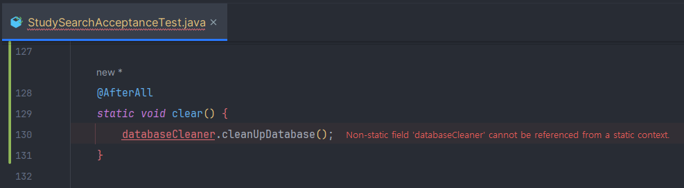 - 테스트에 주입되는 DatabaseCleaner는 non-static이기 때문에 static으로 선언해야 하는 @AfterAll에 적용할 수 없다