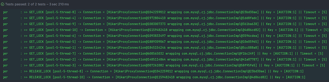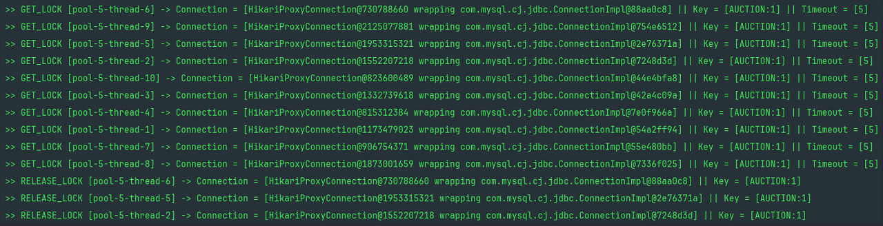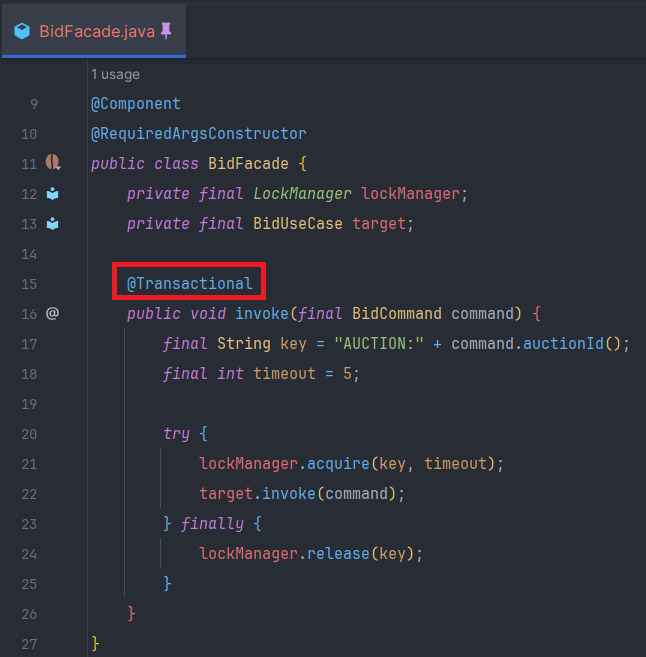 - BidFacade#invoke에 @Transactional을 적용한 이유는 Lock 획득 & 반납과 관련된 Connection을 Transaction별로 일치시키기 위해서이다