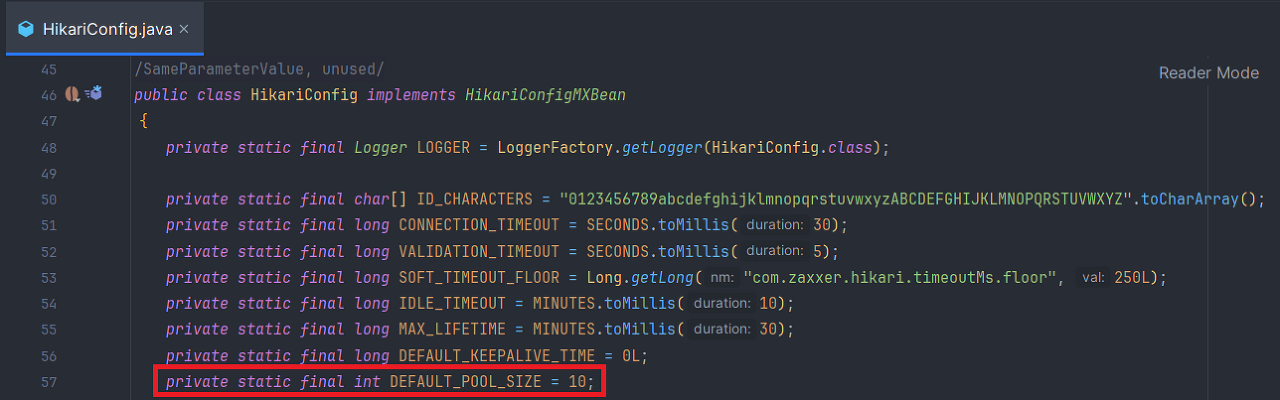 HikariCP는 설정값에 의해서 기본적인 Connection Pool Size를 10개로 잡아놓는다