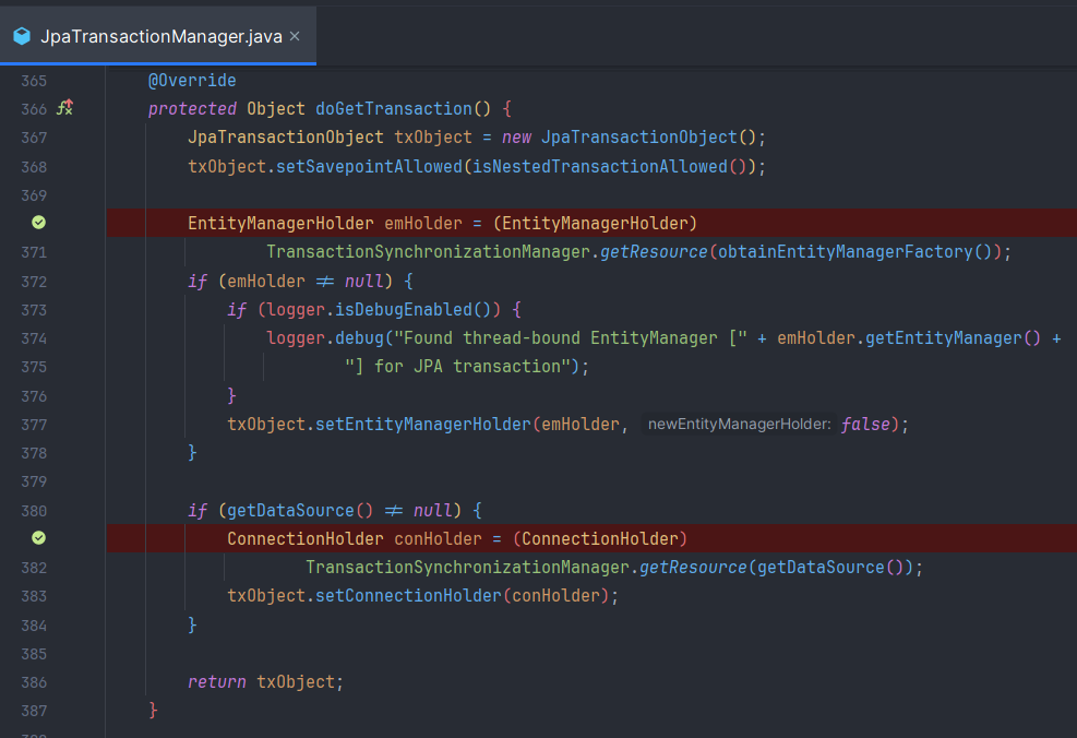 - doGetTransaction에서는 현재 JPA를 사용하고 있기 때문에 EntityManager & Connection을 Holding하는 컴포넌트를 return한다
