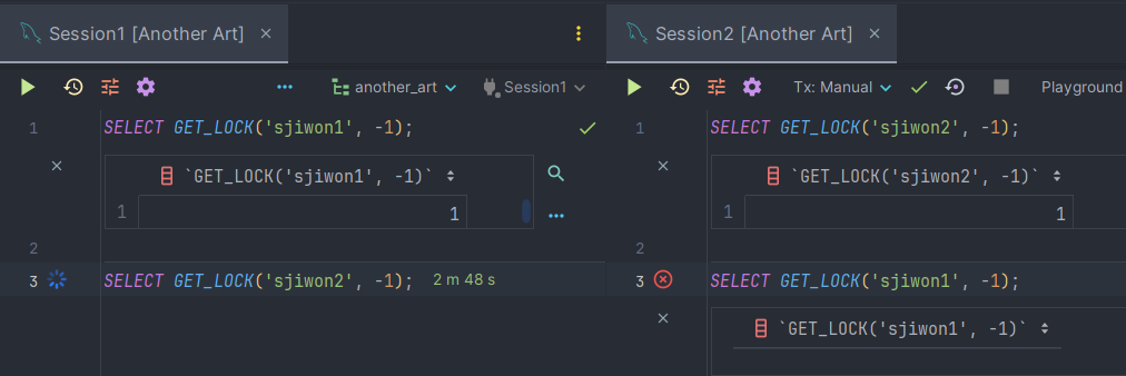 SELECT GET_LOCK('sjiwon2', -1); -- Session 2가 release할때까지 wait