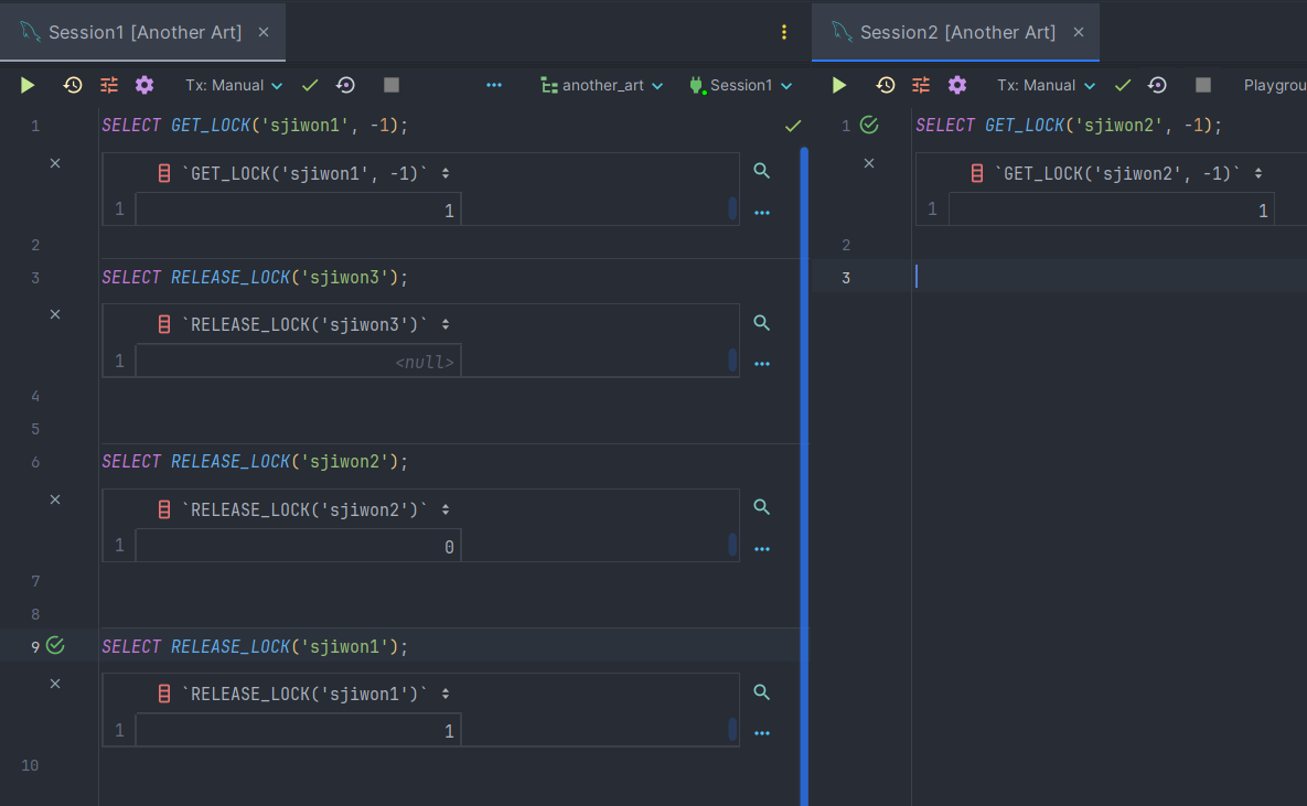 SELECT GET_LOCK('sjiwon1', -1); -- Session 1이 release할때까지 wait