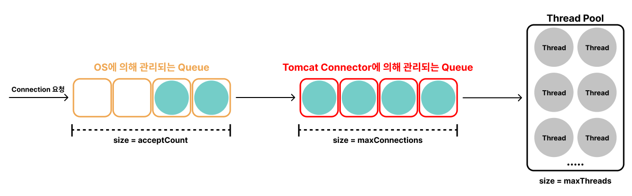 - maxConnections에 도달하더라도 acceptCount 설정에 의해서 OS Level에서 Queuing할 수 있다