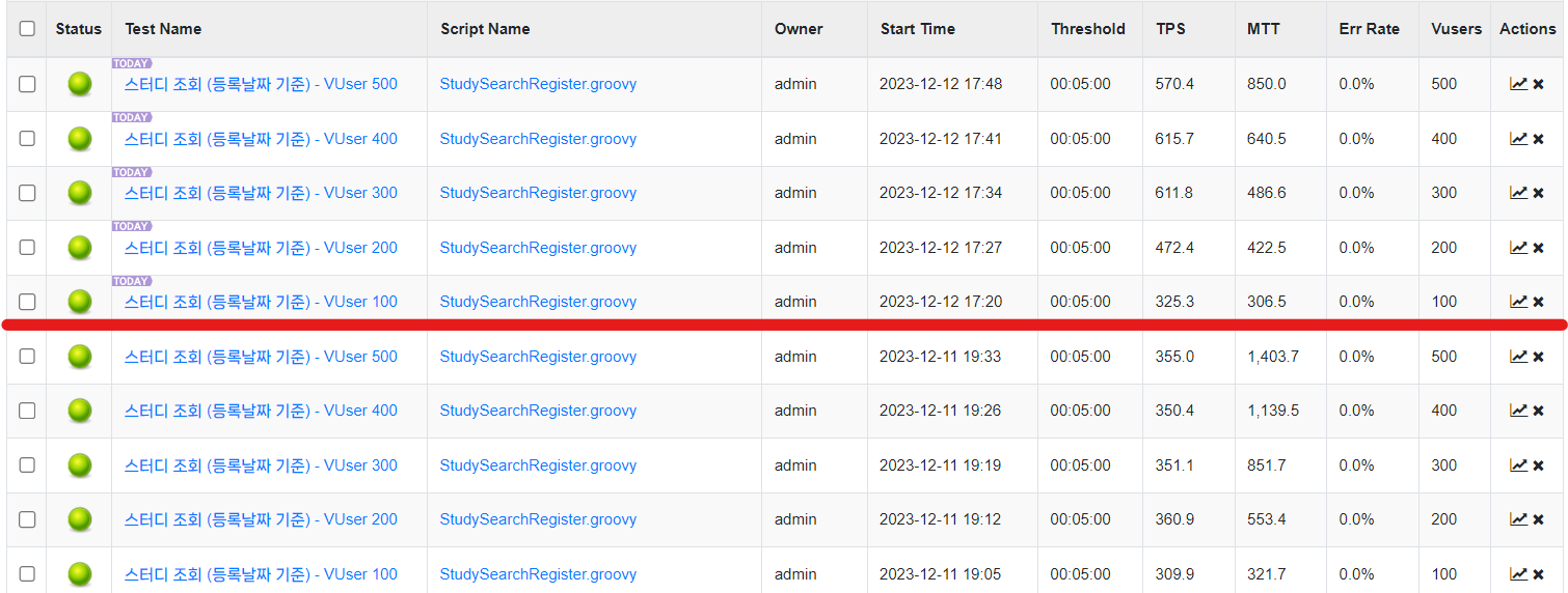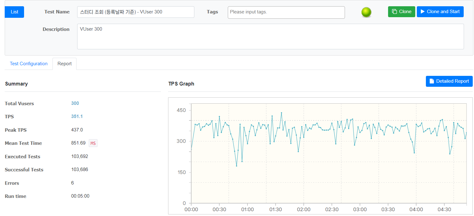 | VUser 300 | TPS = 351.1 (max 437.0) 응답 시간 = 851.69 테스트 횟수 = 103,692 |