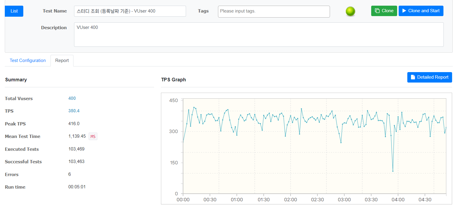 | VUser 400 | TPS = 350.4 (max 416.0) 응답 시간 = 1139.45 테스트 횟수 = 103,469 |