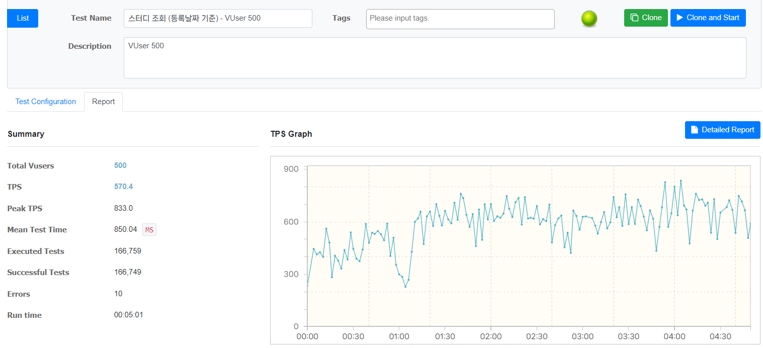 | VUser 500 | TPS = 355.0 (max 428.5) 응답 시간 = 1403.72 테스트 횟수 = 104,180 |